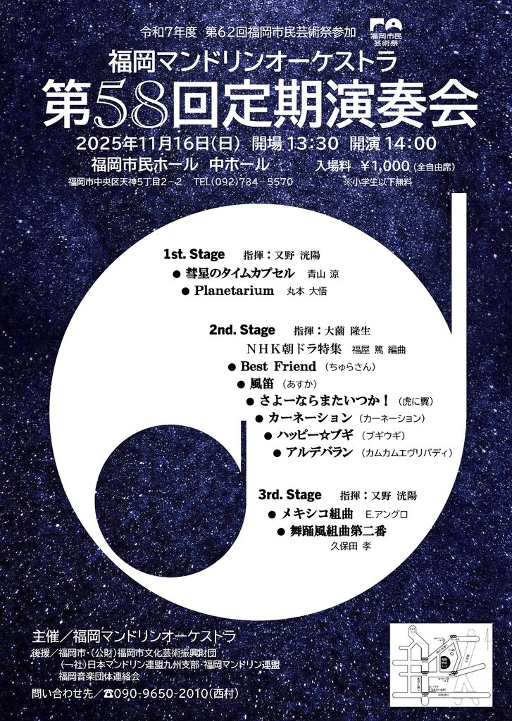 福岡マンドリンオーケストラ第58回定期演奏会 主催:福岡マンドリンオーケストラ 日時:2025年11月16日(日) 開場 13:30 開演 14:00 会場:福岡市民ホール 中ホール 入場料:¥1,000※全席自由(当日券あり) お問い合わせ:090-9650-2010(西村) コメント: